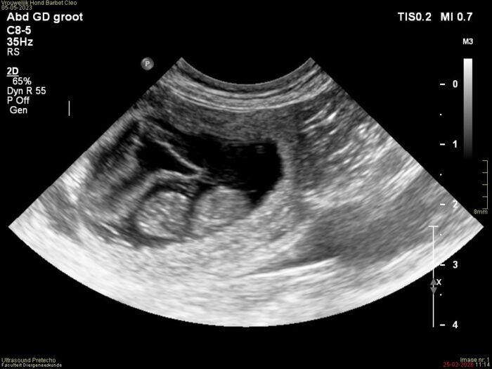 Daarna is er een echo van de buik gemaakt. Een zeer uitgebreide echo waarbij alles heel duidelijk in beeld is gebracht. En toen was daar een kloppend hartje met geluid! Wat is en blijft dat toch een bijzonder moment om dat geluid te mogen horen. Een krachtig hartje van zo’n minuscuul pupje in wording. Want dat is het; de embryo’s zijn nu ca 1,5 cm groot en zien er nu nog uit als een soort pinda. Over een week hebben ze al een ruggengraat, pootjes, een kop en een staart. Het zal zich nu in een razend tempo gaan ontwikkelen. Geen wonder dat Cleo moe is, veel slaapt en minder eetlust heeft. Gelukkig gaan we op naar week 5 en dat betekent voor Cleo dat ze zich langzaam beter zal gaan voelen.