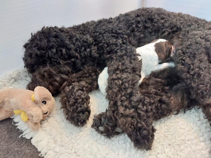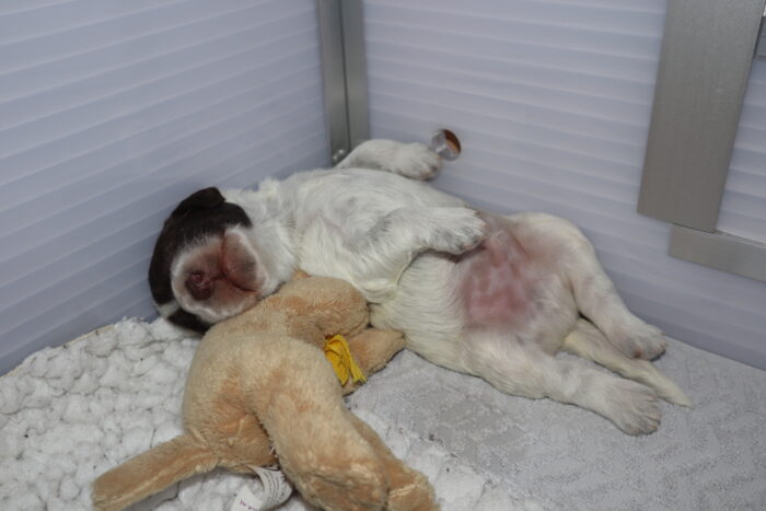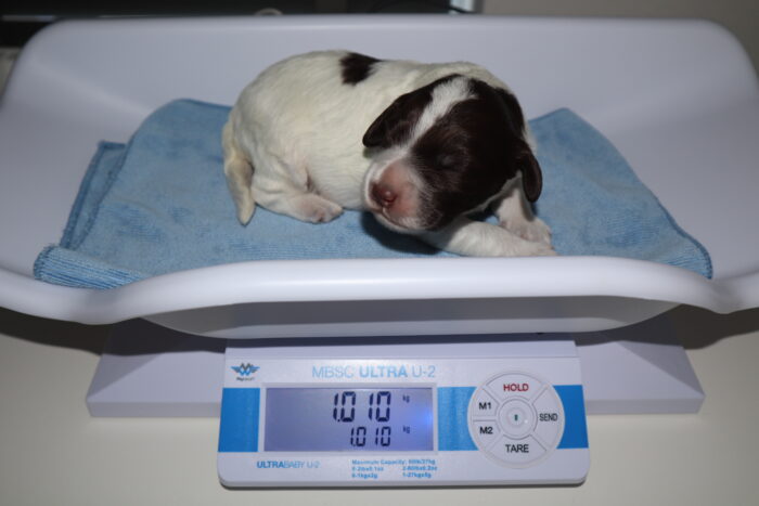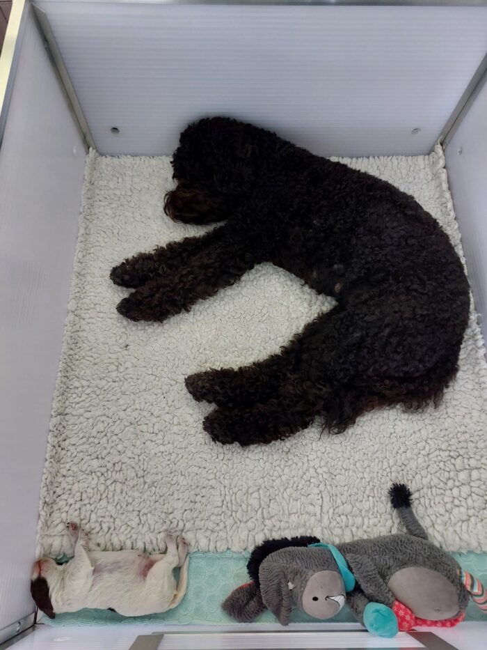 De eerste paar dagen was het fysiek wat zwaarder voor Cleo. Omdat ze maar één pupje te voeden heeft, had ze veel last van stuwing. Met het geven van veel steun, aandacht, liefde en zorg – zoals het koelen van haar melkpartijen – was na een paar dagen alles rustig en bleven er 2-3 tepels over waar Dineau uit kon drinken. Het is mooi om te zien hoe ze nu op elkaar zijn ingespeeld. Wanneer Dineau gevoed moet worden, tikt ze hem aan en dan weet hij: de melkbar is open! Maar ook als Dineau trek heeft, weet hij ook heel goed de aandacht van zijn moeder te trekken en heeft hij daarna weer een gevuld buikje. Week 1 werd afgesloten met de eerste mijlpaal, want Dineau bereikt een gewicht van 1kg.